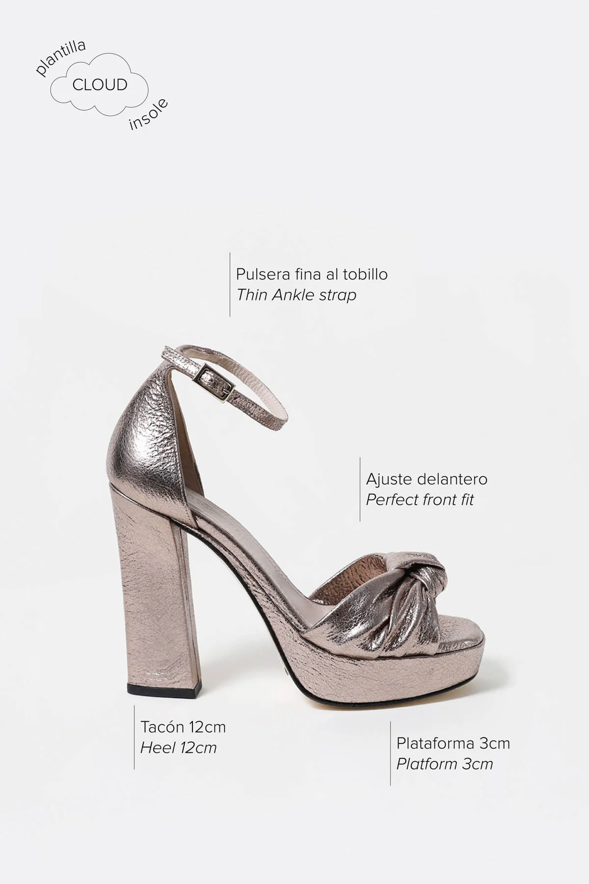 Su tacón tiene 12 cm (incluyendo la plataforma delantera de 3 cm). Además, cuenta con plantilla Cloud acolchada.