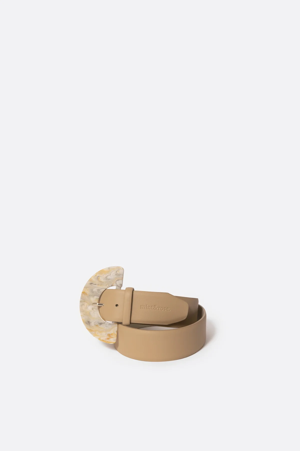 Producción artesanal, materiales cuidadosamente seleccionados y una piel extremadamente suave son la carta de presentación del cinturón Media luna. Exterior y forro de piel con una anchura de 4 cm. Está disponible en talla 85 (desde 75 a 90 cm medidas desde el primer al último agujero) y 90 (desde 80 a 95 cm). Hebilla de metacrilato en forma de medialuna y logo de mint&rose timbrado. Se pueden realizar más agujeros si lo necesitas.