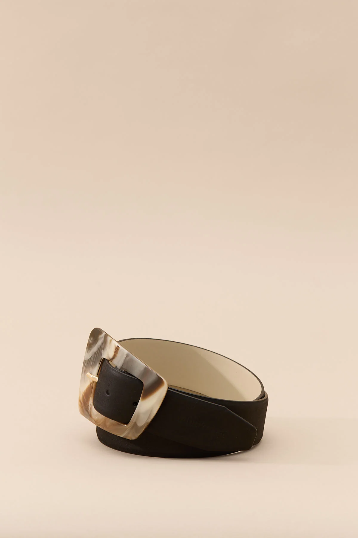 Producción artesanal, materiales cuidadosamente seleccionados y una piel extremadamente suave son la carta de presentación del cinturón Negro Cuerno. Anchura de 4 cm y hebilla rectangular de metacrilato con diferentes betas de color marrón, gris y blanco.