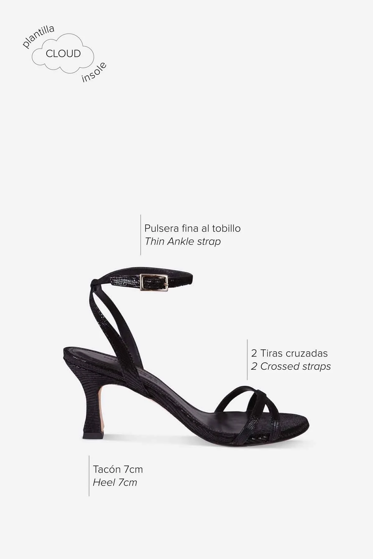 Tiene dos tiras delanteras cruzadas de piel que bordean el pie. Complementa la sujeción una fina tira de pulsera con cierre de hebilla. Tacón acampanado de 8 cm con plantilla Cloud acolchada para la máxima comodidad.