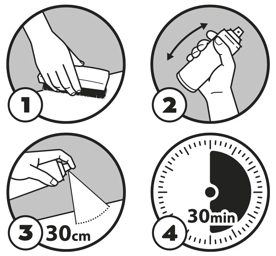- Pulveriza sobre la superficie a tratar desde una distancia de 30 cm.
